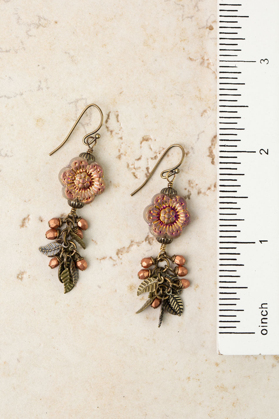 The Czech Glass Collection offers a varied selection of handcrafted earrings, including this cluster design featuring a Czech Glass flower and antique brass leaves for a casual look.