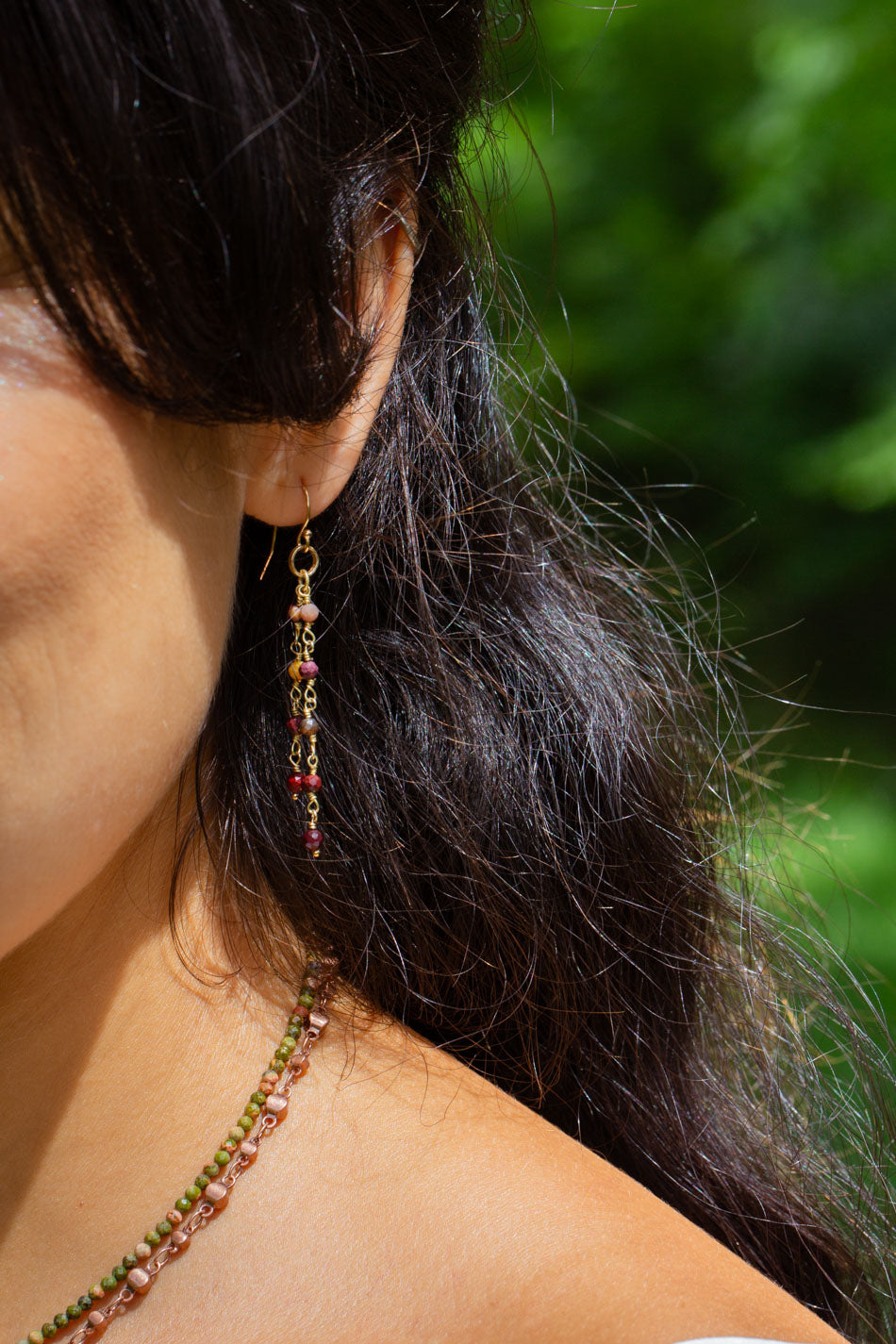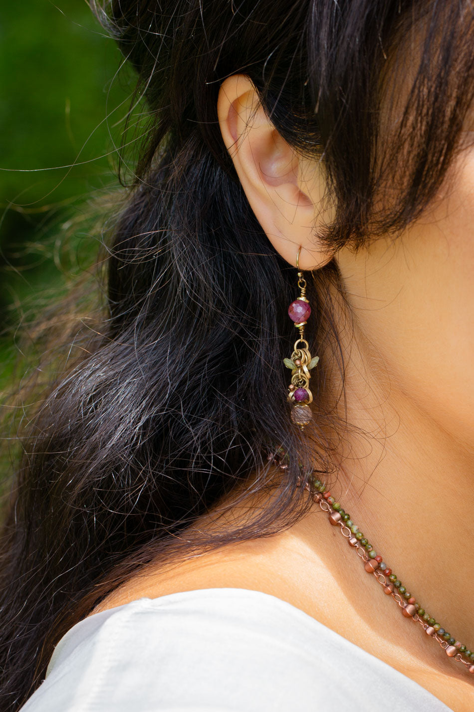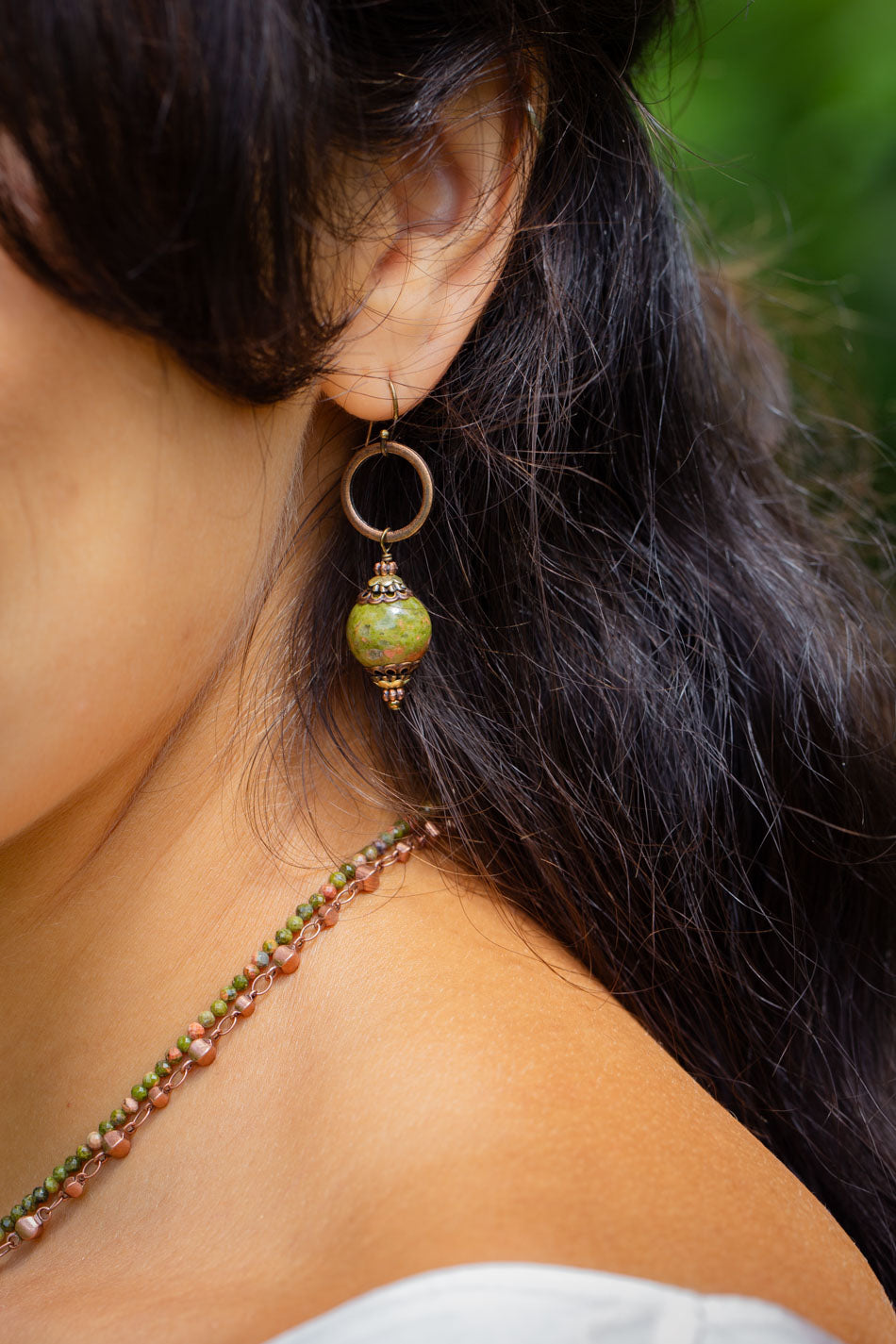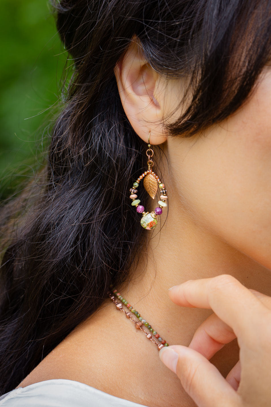 Dominion Unakite, Afghan Jade, Ruby With Antique Copper Leaf Statement Earrings