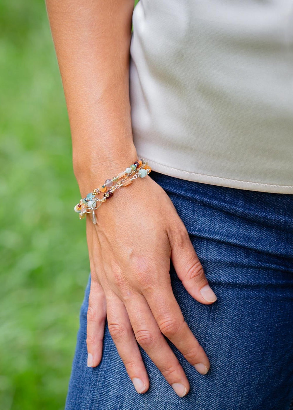 Gentle Breeze 7.5-8.5" Peach Moonstone, Carnelian, Apatite Multistrand Bracelet