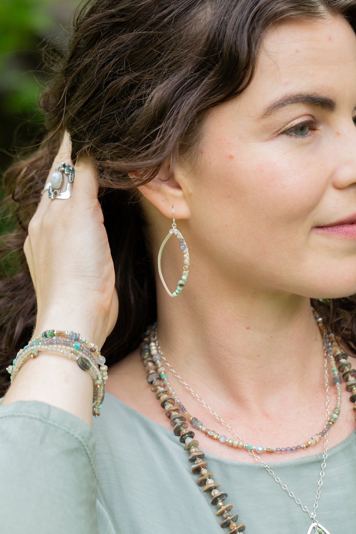 Mystic Turquoise, Freshwater Pearl, Czech Glass And Abalone Hoop Earrings