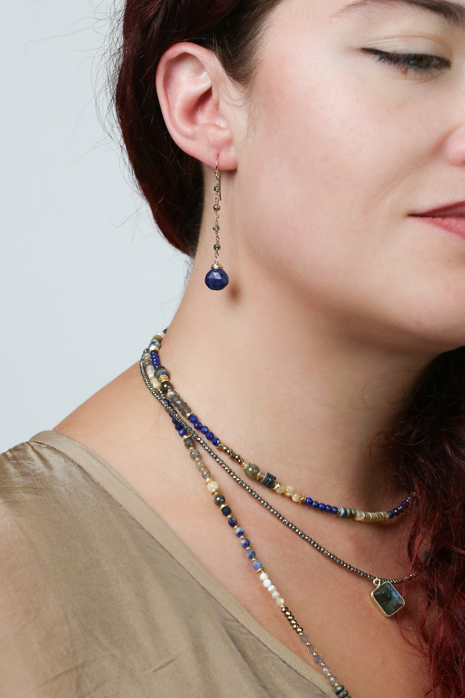 From the Blue Moon collection, these earrings are longer in design with a bold lapis briolette focal.