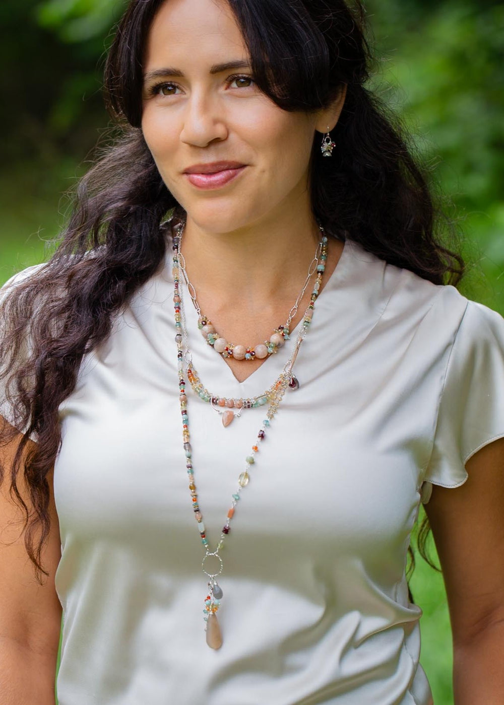 Gentle Breeze features a delicate palette of pastel stones, earthy tones, and subtle shimmer. Each piece is handcrafted with a thoughtful blend of gemstones, creating a harmonious dance of color and texture.